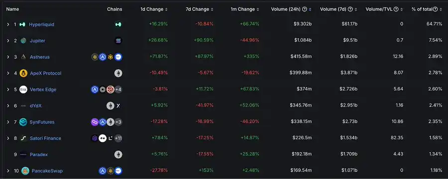 数据显示,在 24 小时内,链上永续合约的总交易量为 143.7 亿美元,而 @HyperliquidX 就占了惊人的 93 亿美元,占比高达 64.71%,展现出 Hyperliquid 在市场上的**统治力。