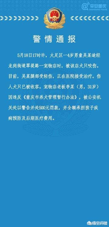 - 目前,吴某腿部受轻伤,正在医院接受**。伤人犬只已被收容。宠物店老板李某(男,31岁)因违反《重庆市养犬管理暂行办法》,被**机关处以警告并处500元罚款,并全额承担吴某疾病预防和后期医疗费用。