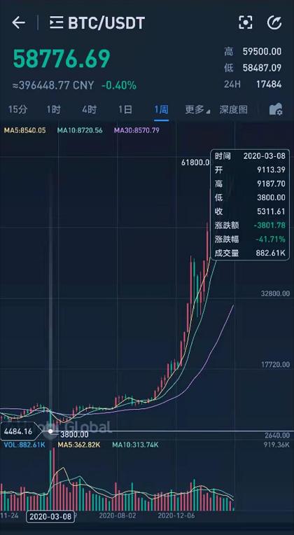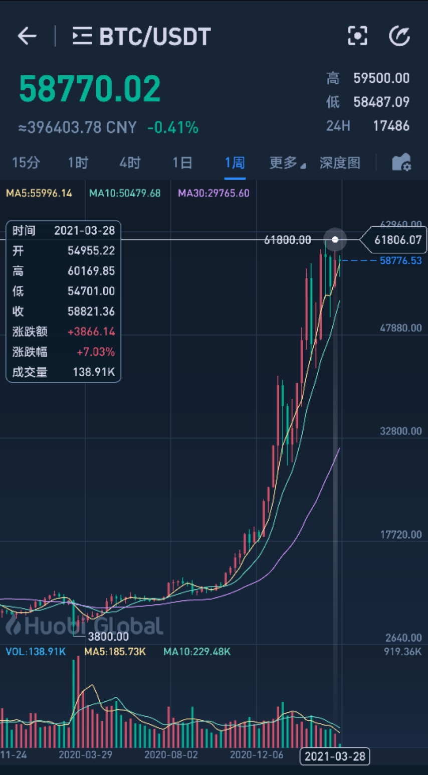 下面这是**的比特币价格,2021年4月份,也是周线图,价格在58000美元左右,换**民币大概在40万左右。