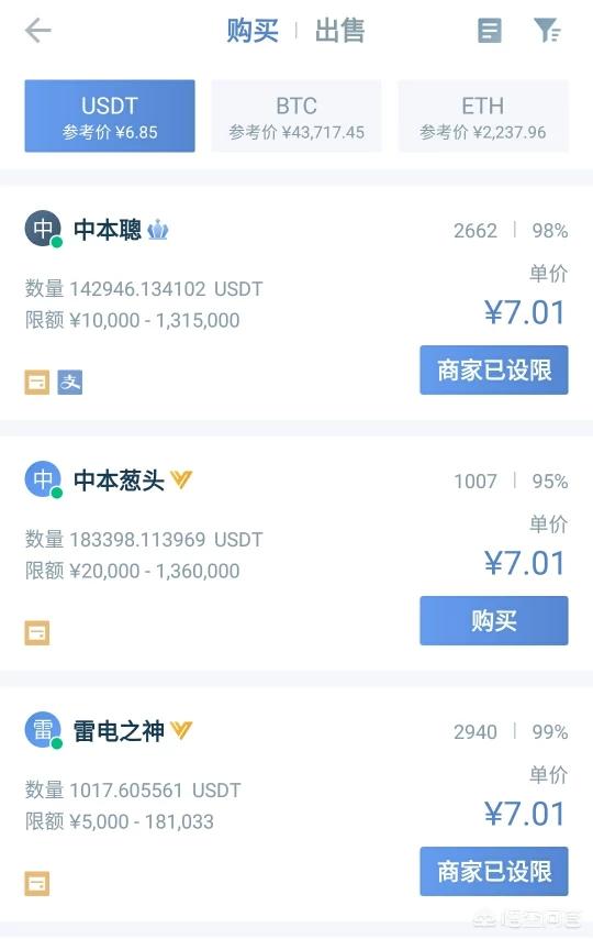 点击之后就会进入充值页面,选择你要充值的币种我们以USDT锚定货币为例进行充值。选择你要购买的卖家,一般支持微信支付,银行支付和支付宝支付,按照付款项进行付款,切定**要有备注码这是平台做中间担保的核心,如果忘记备注可以去和平台和商家沟通,一般诚信率99%的卖家基本上不会欺骗。