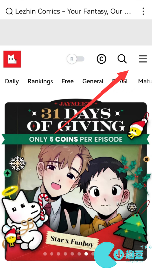 1、首先我们需要打开【lezhin】官网,或者进入lezhin客户端,点击右上角的【三】。