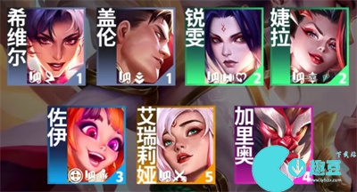 希维尔、盖伦、锐雯、婕拉、佐伊、艾瑞莉娅、加里奥