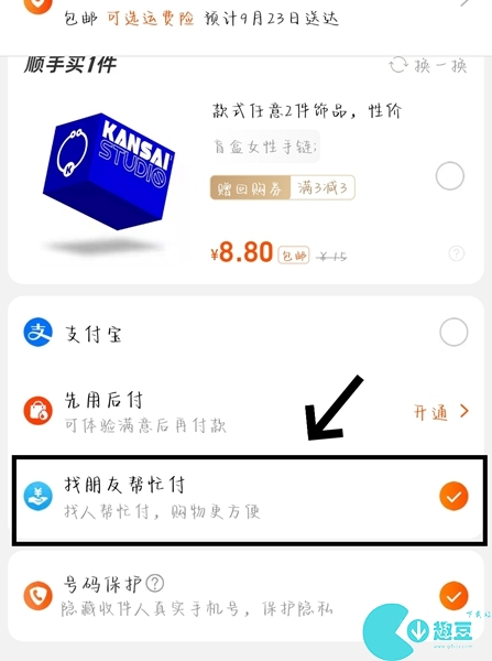 2、选择完商品之后点击下单,在下单完成后不要着急付款,付款界面有个找朋友帮忙付,点击选择。