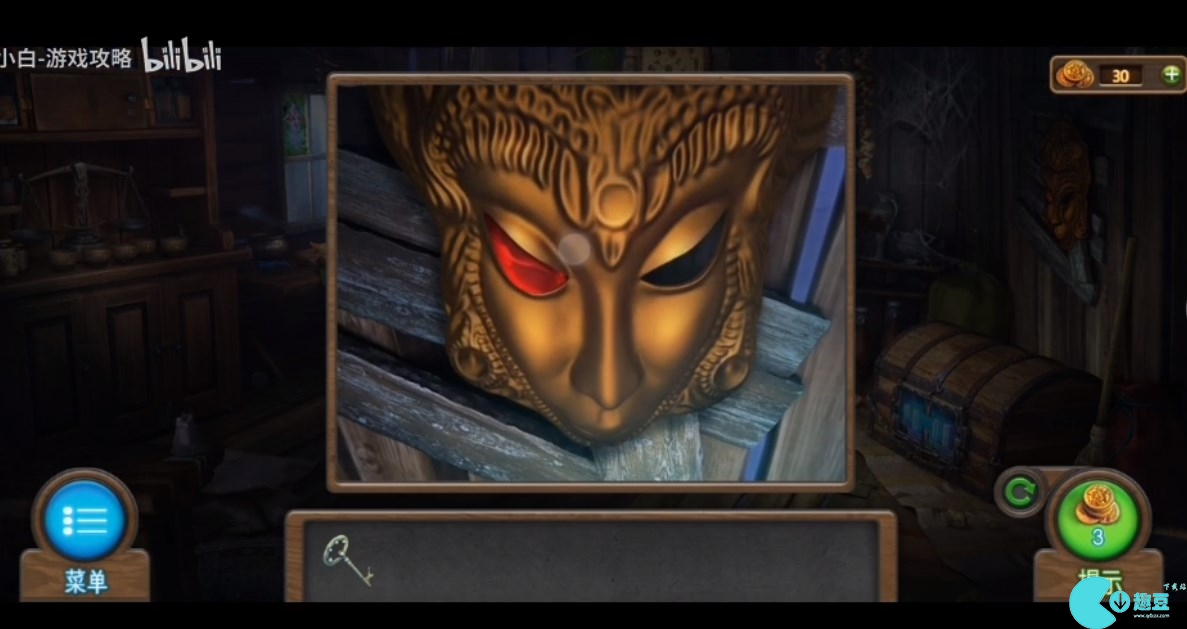 2、点击右侧墙壁的面具,获得面罩里的【绿宝石】,应用【扫把】**右侧角落的蛛网,得到【简单锁匙】。