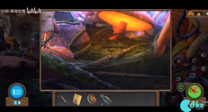 24、查看地上的甲壳虫样本,点击左边的牙,牙掉后再用【手柄】【绳子】得到【锐利的工具】,应用【锐利的工具】,切断前方的蛛网,得到地上的【蛹】。