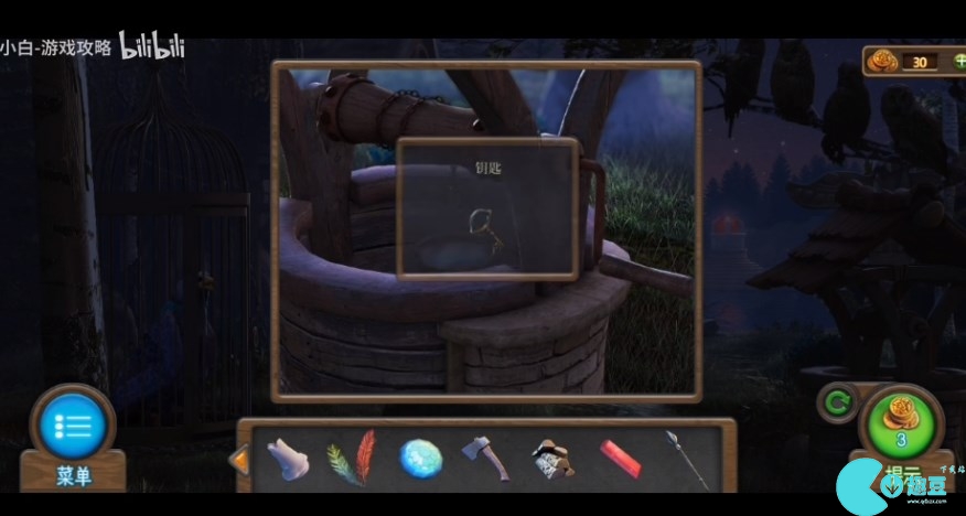 13、回到有鸟笼的庭院,点击右侧的水井,将【手柄】和【空的大锅】安装于水井上,得到【锁匙】和【茶壶】。