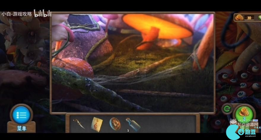 24、查看地上的甲壳虫样本,点击左边的牙,牙掉后再用【手柄】【绳子】得到【锐利的工具】,应用【锐利的工具】,切断前方的蛛网,得到地上的【蛹】。