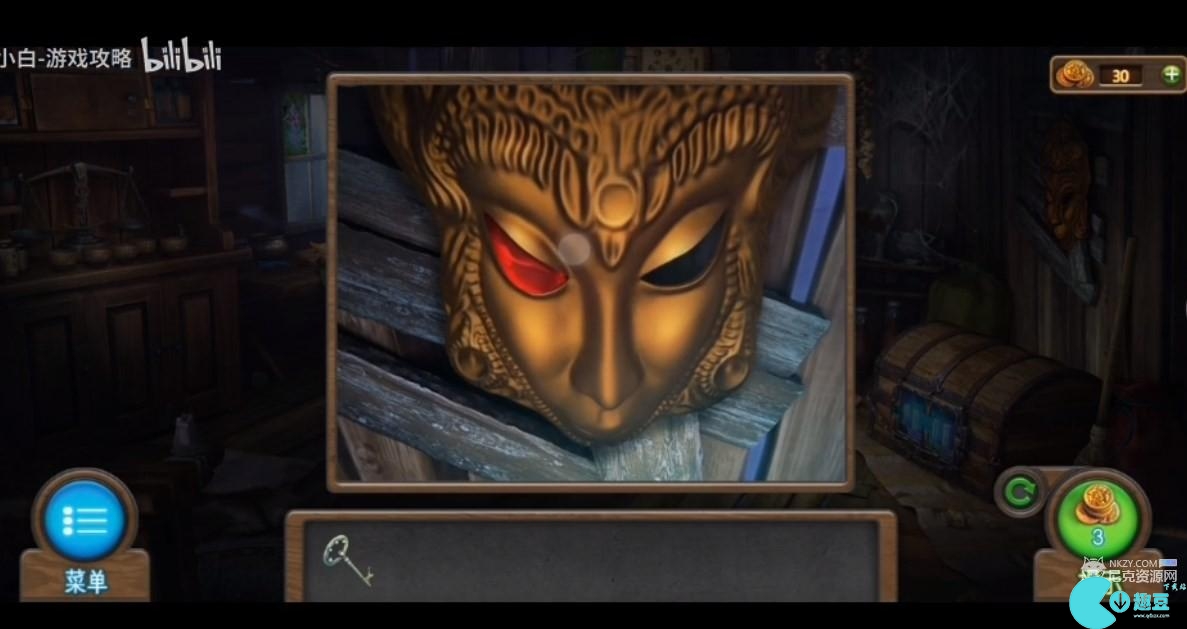 2、点击右侧墙壁的面具,获得面罩里的【绿宝石】,应用【扫把】**右侧角落的蛛网,得到【简单锁匙】。