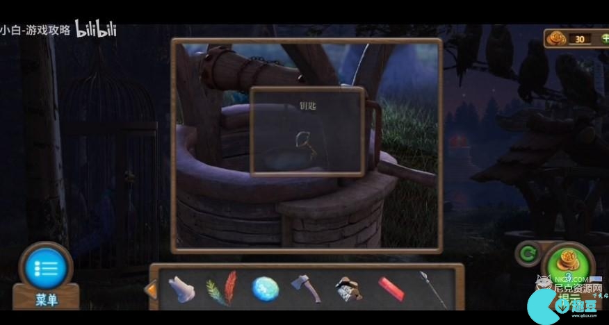 13、回到有鸟笼的庭院,点击右侧的水井,将【手柄】和【空的大锅】安装于水井上,得到【锁匙】和【茶壶】。