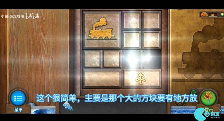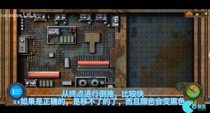 275、赶到动力室,将【碎片】安装于右侧玻璃柜的凹槽中,完成拼图联线小游戏(如图将右侧格子里的火车轨道放在左边的图中,使火车轨道可以连接),拉掉制动阀门,点击门出来。