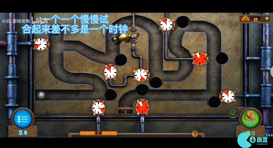 (游戏中一共有8个表盘,每个表盘中白色的部分代表了没有蒸气,红色部分代表**蒸气,通过控制表盘上红色部分位置,调节**蒸气的时间,从而使左边的铁球顺利地躲避黑洞,到达终点)。