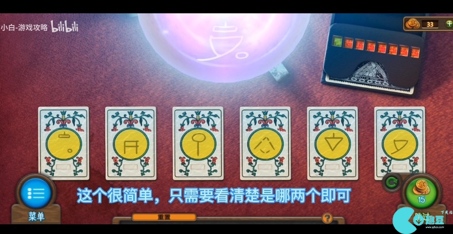 253、回到街道右侧的屋子,查询右侧铺着红布的餐桌,将水晶球放到桌子上的架子中,进行拼图小游戏(游戏的难度较低,依据水晶球里的图案寻找下边牌组中可以组成这一花纹的两张牌,直至照亮出牌器里的8个灯)。