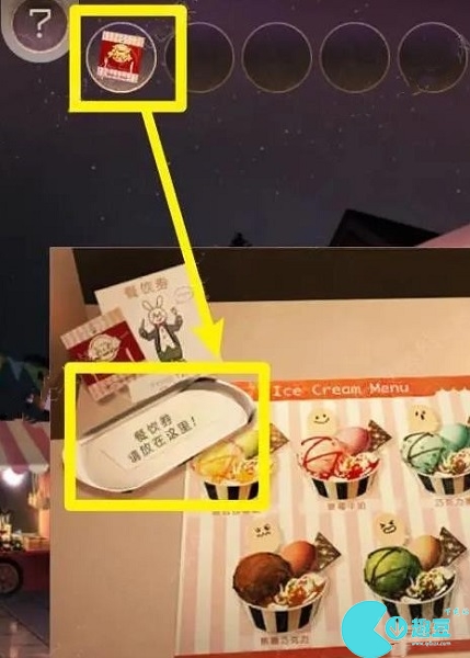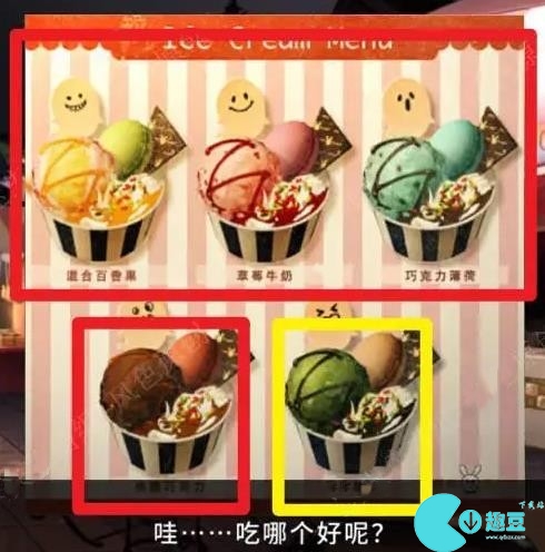 5、在几种冰淇淋中选一种冰淇淋吃(红框和黄框冰淇淋是后面鬼屋的探索线索)。