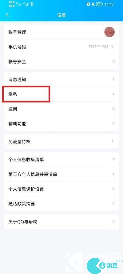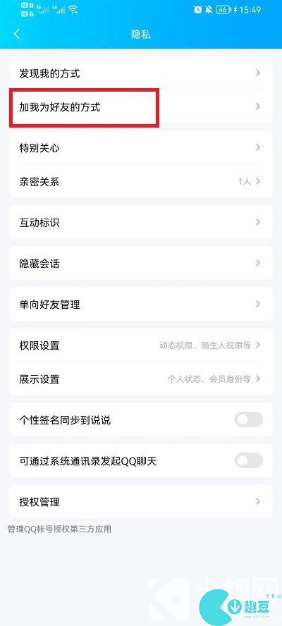 4、点击【隐私】,进入【隐私】界面,找到【加我为好友的方式】。