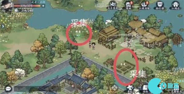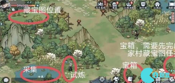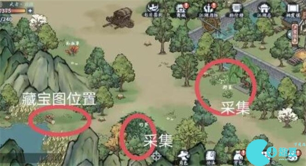 4、地图下方能够获得两个采集点,在河边能够看见藏宝图。