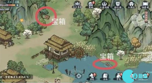 5、水车旁边能够找到宝箱,山洞中有藏宝图。