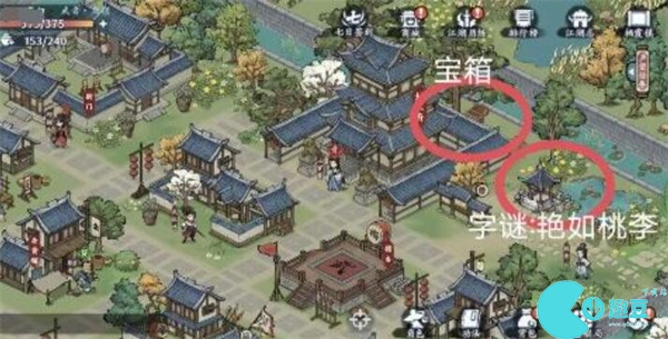 3、护城河边上有着一个宝箱,凉亭中能够触发解谜,答案:艳如桃李。