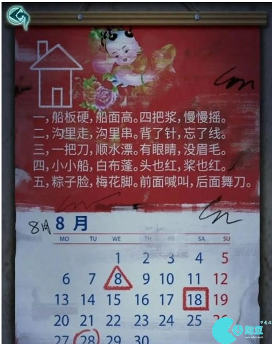 7.外出到院子,把米糕交给女童后水缸能靠近了,看来后面要用水啊,正向的房屋也能进入了,进去看一眼是库房。先查看一下纸人右边的木板,提醒要一物换一物,查看纸人手里的拖盘不许取墨块,那么我们把木碳放到拖盘里就能拿走墨块了,右边的日历上线索比较多,首先是上边的解迷这个我们后续结合线索看,数字能看到三角形=8,正方形=18,圆形=28记下来。
