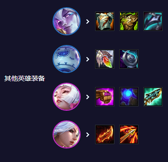 锤石:作为坦克兼辅助,装备石像鬼石板甲、狂徒铠甲和龙爪(适应性头盔),分别提供双抗、大量生命值以及魔法抗性,确保锤石能够有效地吸收伤害并保护队友。