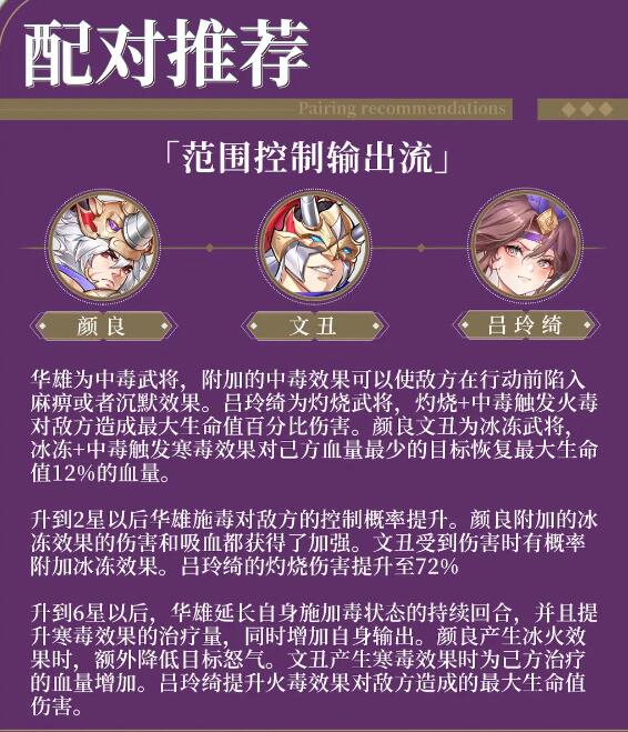 解析:这套为范围控制输出流,通过华雄的中毒来让敌人陷入控制,再与吕玲绮的灼烧打出火毒的百分比伤害,颜良文丑还能触发寒毒,恢复己方英雄血量。