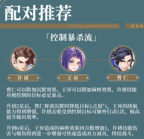 解析:这是一套控制暴杀流的阵容,通过曹仁与王异的控制,让许褚对被控制的敌人打出**的输出。