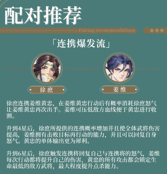解析:这是一套连携爆发流的阵容,能够让姜维黄忠行动后消耗徐庶怒气,再起行动,压低血线后让黄忠进行收割。