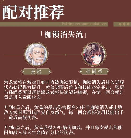 解析:这套为枷锁消失流,黄盖在对战一段时间后将会进入觉醒状态,通过张昭与孙尚香的辅助可以帮助黄盖提早觉醒,让黄盖在**回合就能够满足百爆。