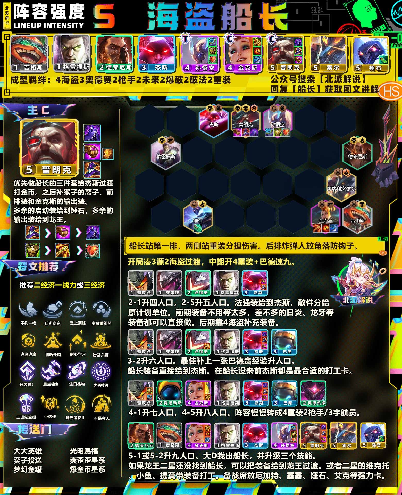 3-2升6,4-1升7,选秀结束找机会上8,8级看你实际情况要不要搜点质量,2星猴子、2星杰斯是前排,排除来5费卡的欧皇情况,抽到2星小鱼人过渡打控制也很强,8级稳得住或者5-2左右钱够了就找机会上9,开始搜1张船长换装备,4海盗炸的差不多感觉外面有打不过的了,就开始降为2海盗 45费单挂