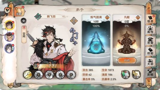 弟子实力受词条天灵根影响。为弟子搭配合适词条可有效提升战斗力。请关注弟子潜能培养,以便在江湖中所向**。