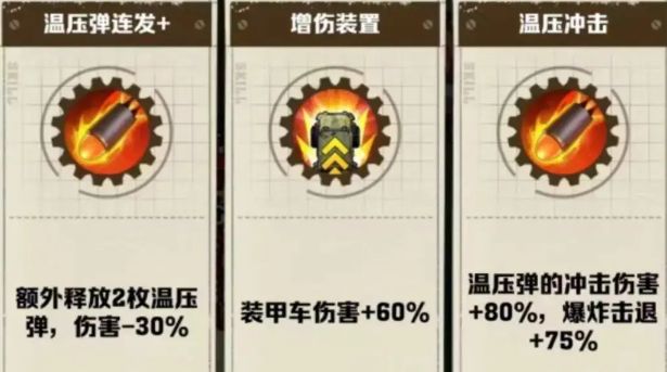温压弹虽然是所有技能里面最普通的,但是它的综合属性**可以碾压大多数技能,初始我们只能发射一枚飞弹,不仅数量少并没有**控制效果,以下是关于温压弹的技能组合表。