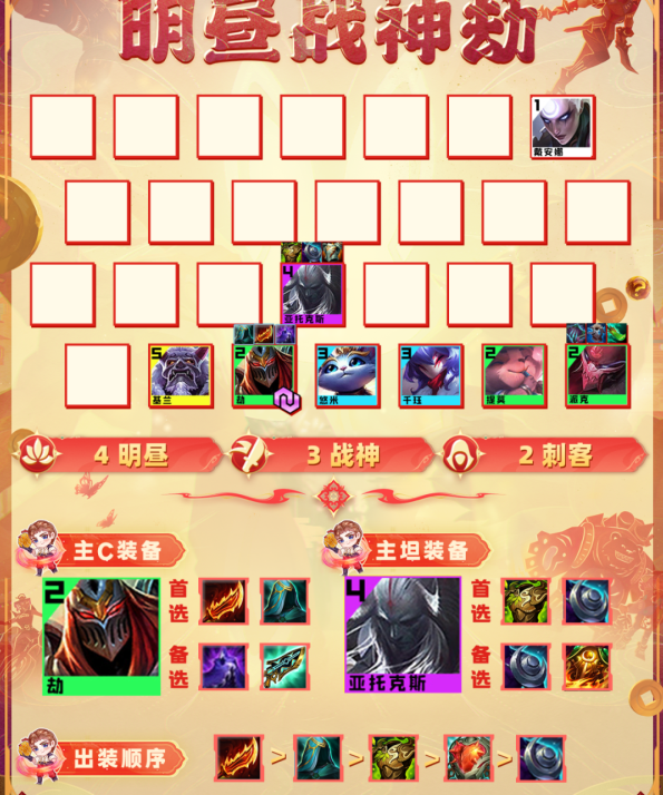 1.金铲铲之战明昼战神劫阵容组成:皎月、劫、提莫、悠米、派克、千珏、剑魔、时光、奥恩