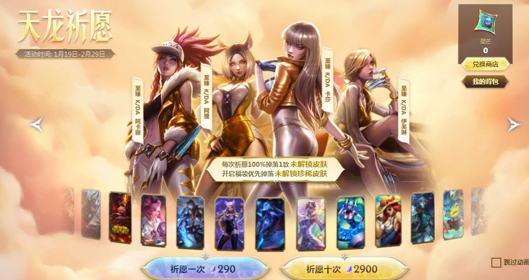 英雄联盟天龙祈愿活动概率是多少,有哪些皮肤可以抽出来的,6元可以100%刷出没有的皮肤,**召唤就可以解锁新的皮肤,**有**皮肤可以得到的,下面就来介绍下英雄联盟天龙祈愿活动有哪些皮肤。