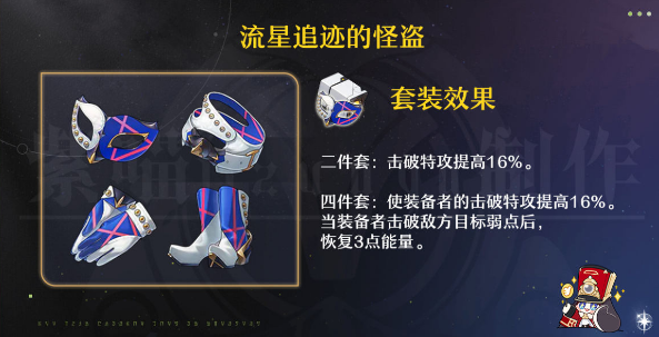 解析:这个套装二件套提供击破特攻,四件套也提供击破特攻,并且在装备者击破目标弱点时会提供少量回能。这个套装是在阮梅实在堆不够击破特攻时才考虑的套装。能够**一部分词条压力,并且虽然四件套的回能效果以阮梅只有普攻能削韧的**来说几乎等于没有,但偶尔也是能有奇效的。