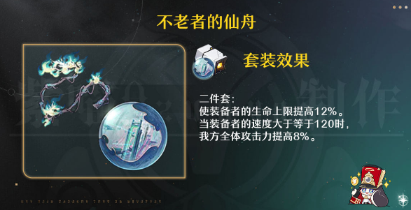 套装的第二个效果可以让阮梅在战斗开局大量行动提前,基本上能够做到**个行动,配合阮梅的秘技可以快速施放终结技,覆盖**轮爆发输出。并且在高速(173速)的情况下有机会做到首轮三动。在无需首轮行动提前的效果情况下,这个套装也是就单纯为了5%充能。