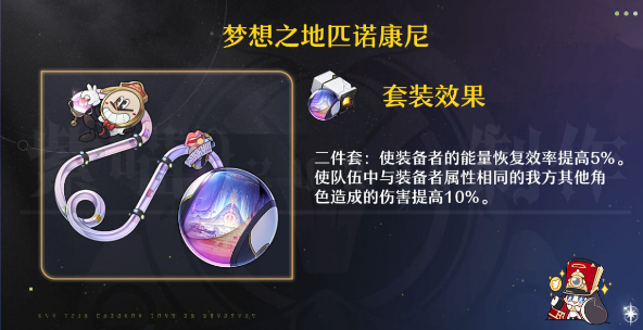 解析:这个套装常态提高能量回复效率,可以加快阮梅的充能速率,对不想凹受击,又想要三动满能的阮梅来说会比较舒服,搭配充能绳和叠影5级的记忆中的模样即可达成。套装的第二个效果可以给同属性的队友提供增伤,对阮梅来说就是冰属性的队友,在辅助冰属性的输出时建议优先选择这个套装。对辅助其他属性输出来说这个套装就单纯为了5%充能。