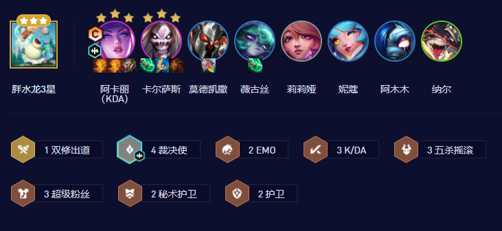 阵容羁绊:1双修出道、4裁决使、2EMO、3K/DA、3五杀摇滚、3超级粉丝、2秘术护卫、2护卫