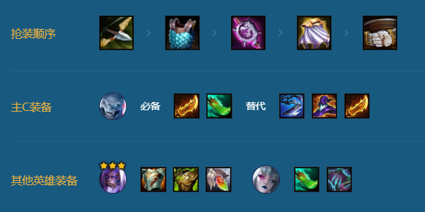 慎羊刀青龙刀启动必备,**一件巨杀帽子可以帮助队伍快速过前排。约里克带板甲、狂徒、反甲、龙牙等肉装,后补莫甘娜上鬼书挂重伤。
