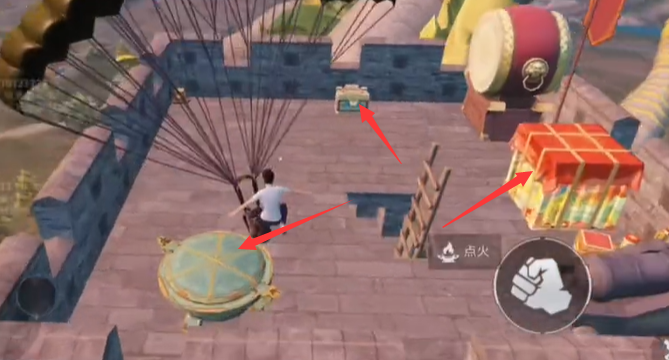 2、然后找到箱子、空投点击拾取,拿到加特林对着如下图箭头所示的物品点火;