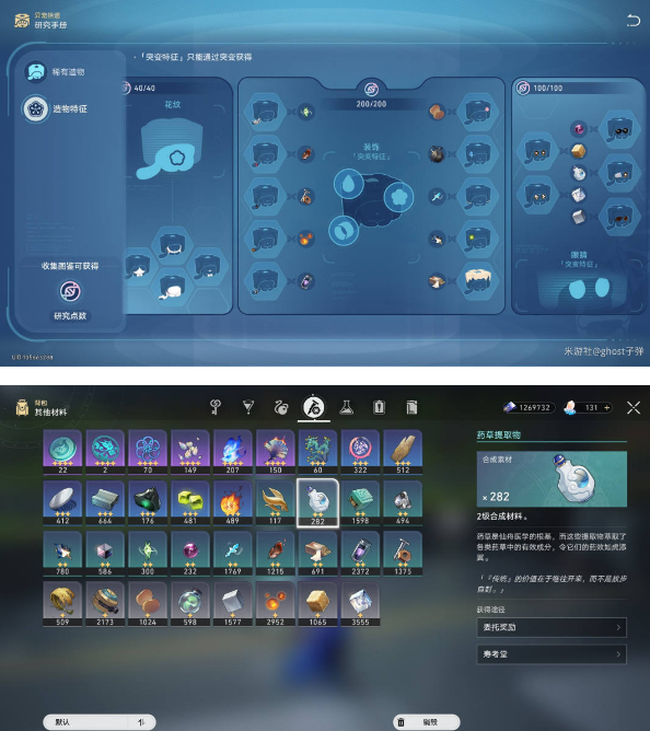 解决方法也很简单,就是任意选择一个稀有造物,不满足它的**配方要求,然后不断地培育,大概十几次左右会遇到突变,突变的四种材料是随即选择展示的,可以根据下面的图片选择没收集齐特征所对应的材料来投入(凹就完事了)。