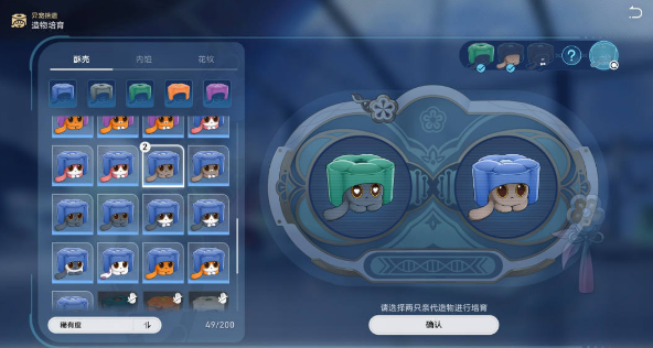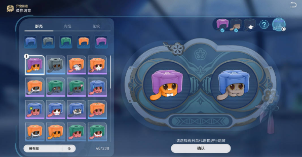 由于我们没有紫壳·灰馅·的造物,所以需要先将紫壳的造物,和灰馅的造物培育,培育出紫壳·灰馅·的造物(PS:这里注意是灰馅的造物,由于很容易跟黑色的搞混,所以要看清楚一点)