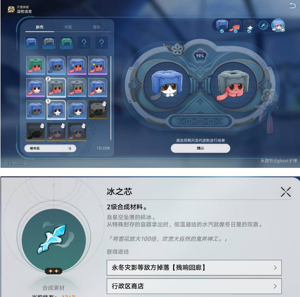 需要放入蓝壳·星星花纹·的造物,和红馅的造物培育,在出现特殊突变时放入冰之芯即可。