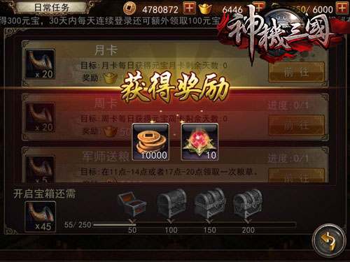 《神机三国》对于新手们来说先了解一款游戏是相当有必要的,下面小编将给新手玩家们介绍任务系统奖励,游戏中的资源是相当稀缺的大部分都是通过做任务得奖励来的,所以想玩好这款游戏首先得了解好它的任务系统奖励!就算是RMB玩家有些材料或是资源也都是需要在任务系统奖励中获得的,所以对于刚入手这款游戏的非R玩家,这些任务系统奖励**是你玩好游戏的关键!