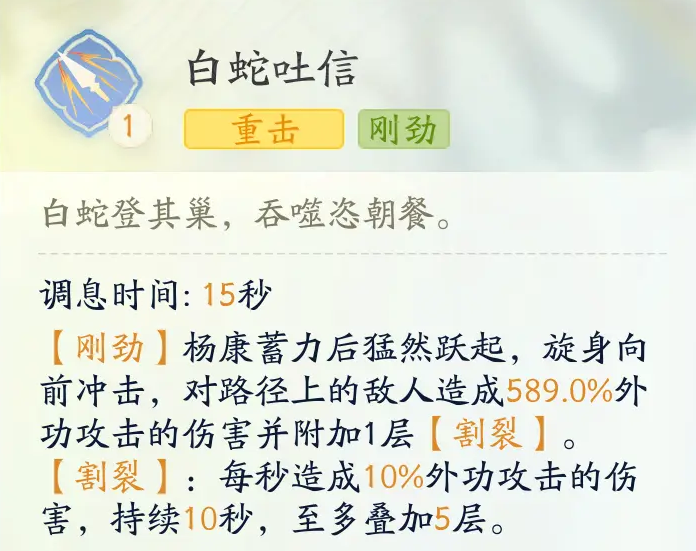 1、普攻-白蛇吐信:对敌人造成伤害,并施加割裂debuff。