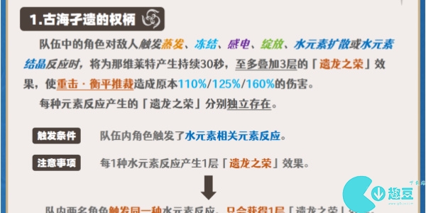 固有天赋1:队伍中的角色对敌人触发蒸发、冻结、感电、绽放、水元素扩散或水元素结品反应时,将为那维莱特产生持续30秒,至多叠加3层的「遗龙之荣」效果,使重击·衡平推裁造成原本110%/125%/160%的伤害。每种元素反应产生的「遗龙之荣」分别独立存在。