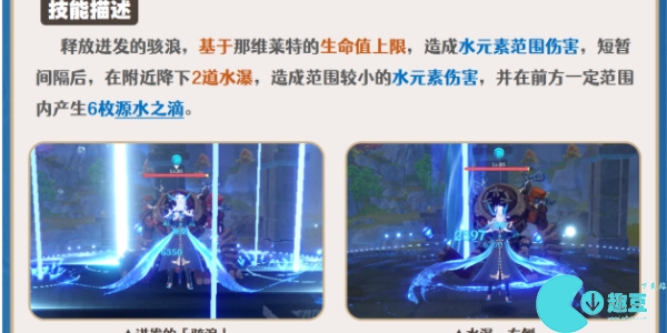 降下汹涌的水瀑,基于那维莱特的生命值上限,对前方的敌人造成水元素范围伤害,命中敌人后,将在敌人附近产生3枚源水之滴。
