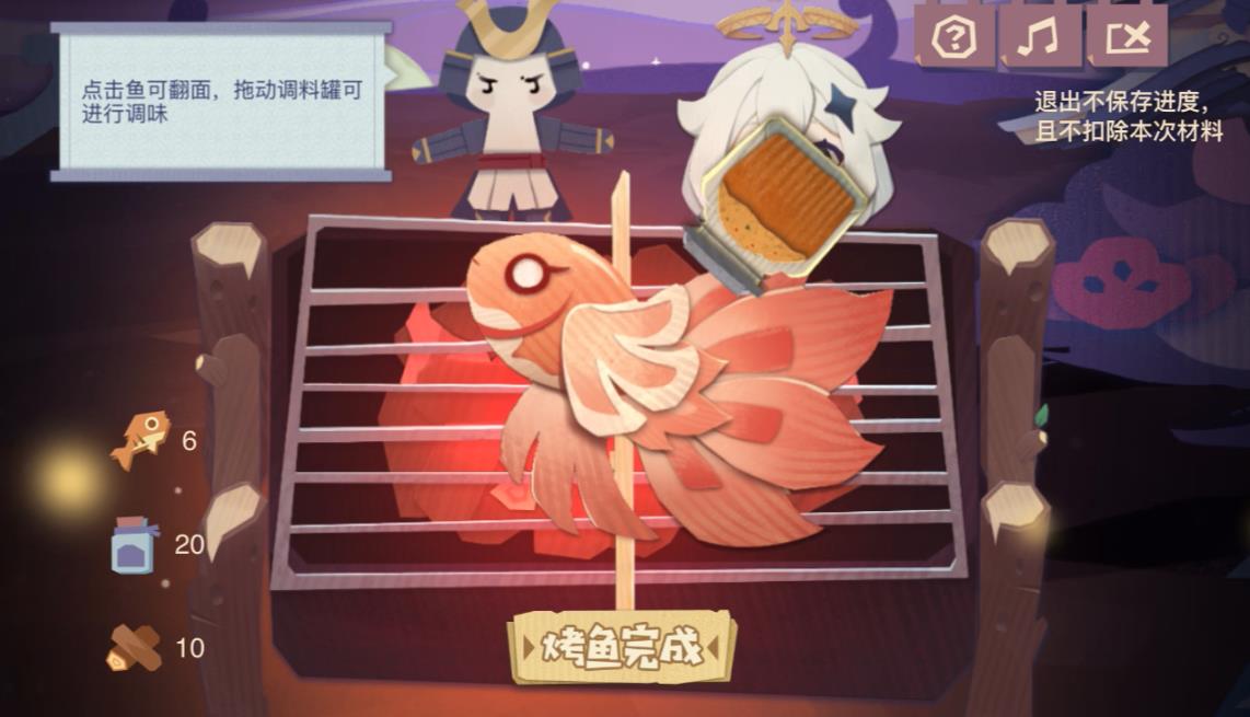 烤制:将调味后的鱼放置在烤架上,用火烤制。玩家需要控制火候,避免将鱼烤糊,一般来说,鱼肉变为金黄色即为熟透。