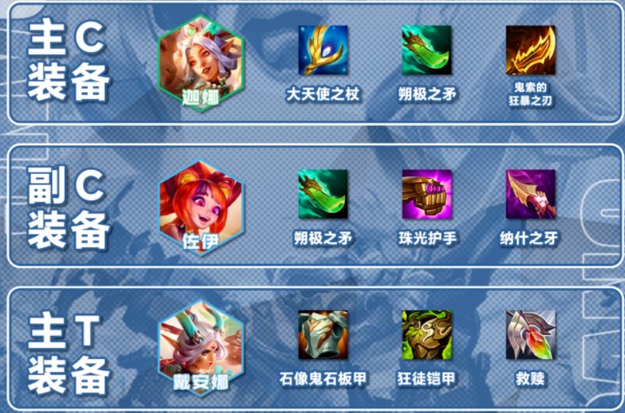 这是一套非常灵活的多C位阵容,迦娜、佐伊甚至婕拉都可充当C位,而且这3枚棋子装备都可互转,说白了谁能3星谁都可主C。
