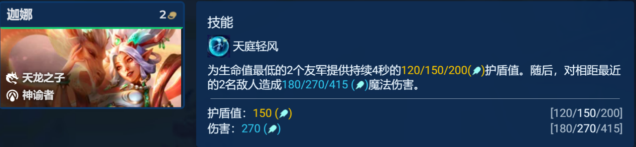 大多数时候我们会考虑迦娜主c,主要看迦娜能不能三星。迦娜技能非常强势,她不仅能给两个友军提供4秒的一个高额后盾,来增强阵容的续航能力;技能还能造成一个中等的魔法伤害,特别是三星这魔法伤害会非常高,搭配大天使叠加法球,15秒后伤害炸裂。迦娜主C也可称为万盾流,其只有25/75的法力值,搭配朔极之矛与鬼索技能释放非常**。一局非常容易护盾与伤害均过万。