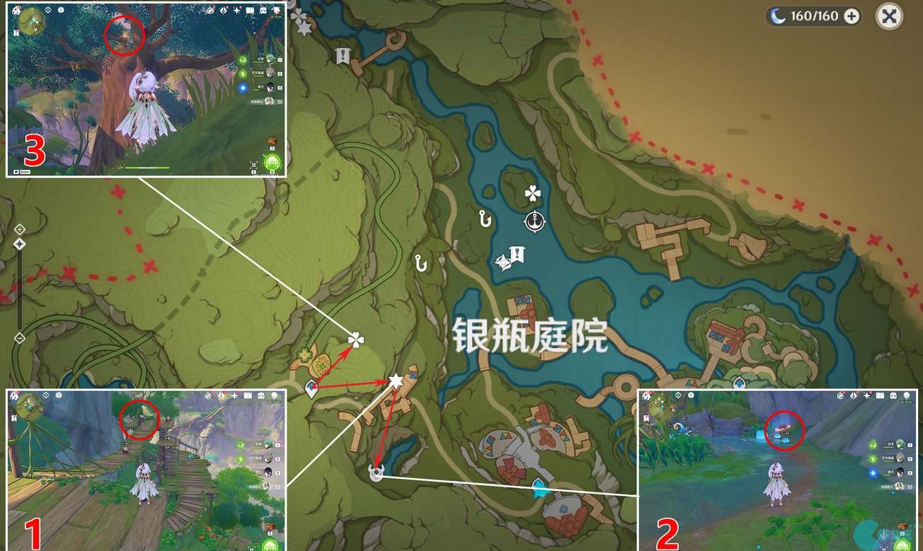 3、银瓶北地区的采集路线如下图所示:(4)与须弥蔷薇交互再与幻灵对话,(5)击败魔物解救幻灵。