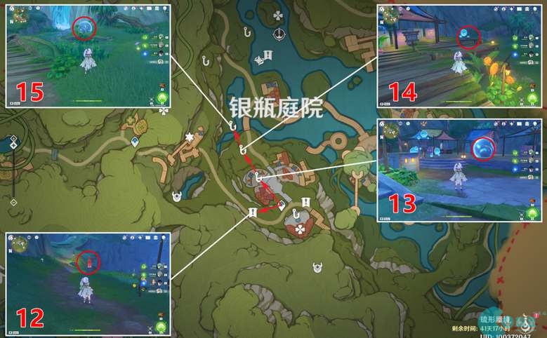 4、银瓶南(13)捉迷藏的三个幻灵藏在这三处,(14)给此处的幻灵投喂3次苹果,(15)借助瀑布底下的幻灵解开封印即可。